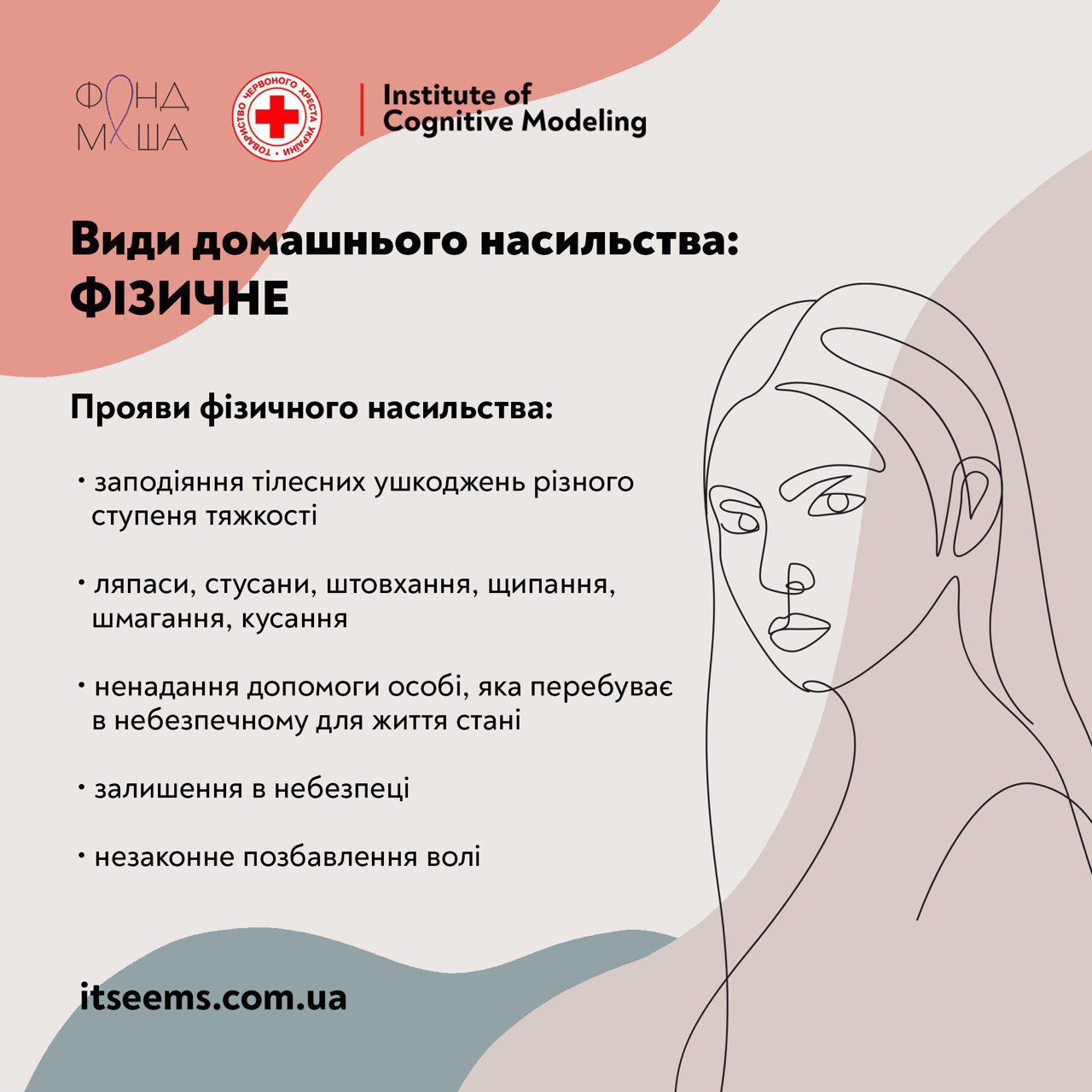 Це коли вас б’ють чи штовхають, не випускають із власного дому або не пускають до нього, змушують до вживання алкоголю чи наркотиків. Вам погрожують позбавити життя чи навмисно створюють ситуації, які можуть становити загрозу вашому здоров’ю та безпеці. Проти вашої волі вас переміщують у межах однієї держави або за кордон із застосуванням сили, погроз чи обману.